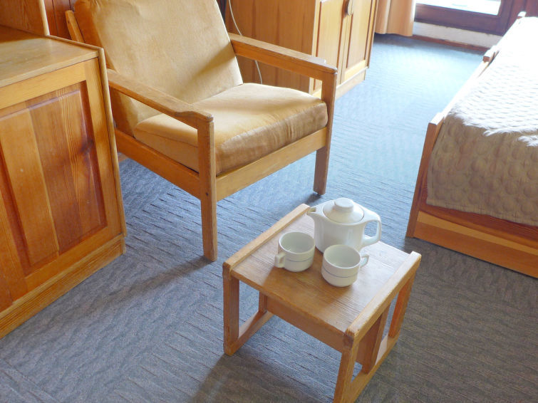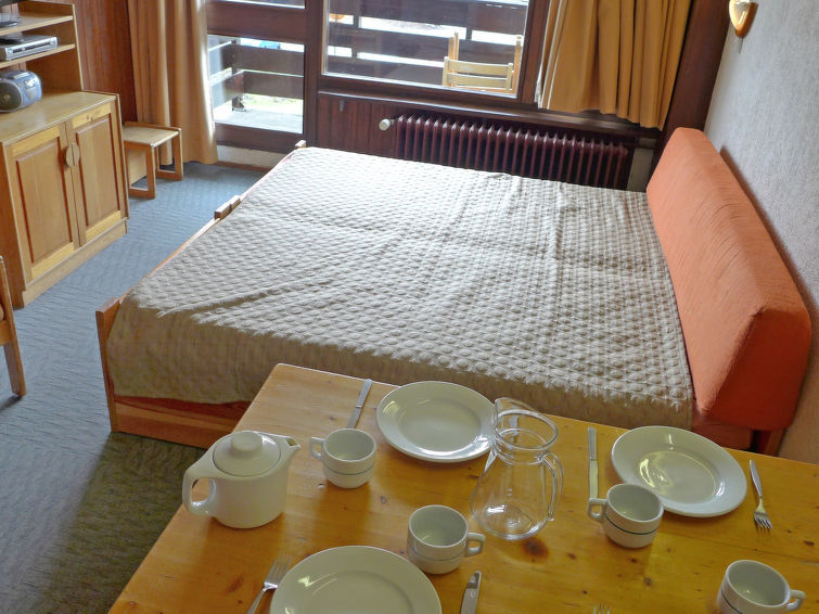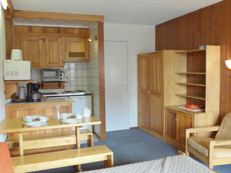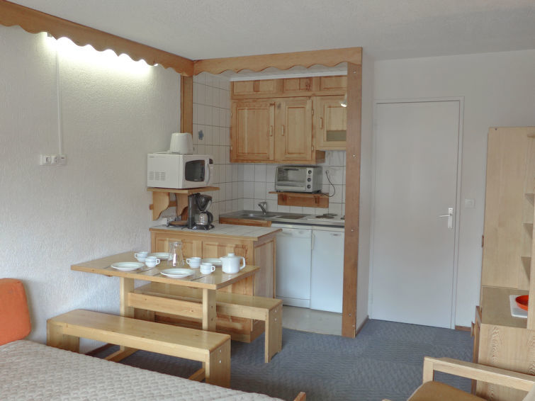 Studio 1-kamer 28 m2 op de 1e verdieping. Doelmatig en comfortabel ingericht: woon-/eetkamer met 2 bedden (80 cm), TV en radio. Hal met 1 x 2 stapelbedden (80 cm). Kookhoek (4-pits kookplaat, mini-oven, afwasmachine, magnetron). Bad/WC. Op het zuiden gelegen. Ter beschikking: Internet (Internet (WiFi), extra). Niet rokers woning. Rookmelders.
