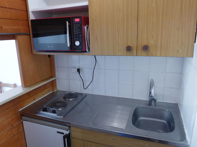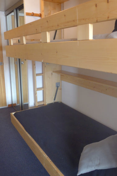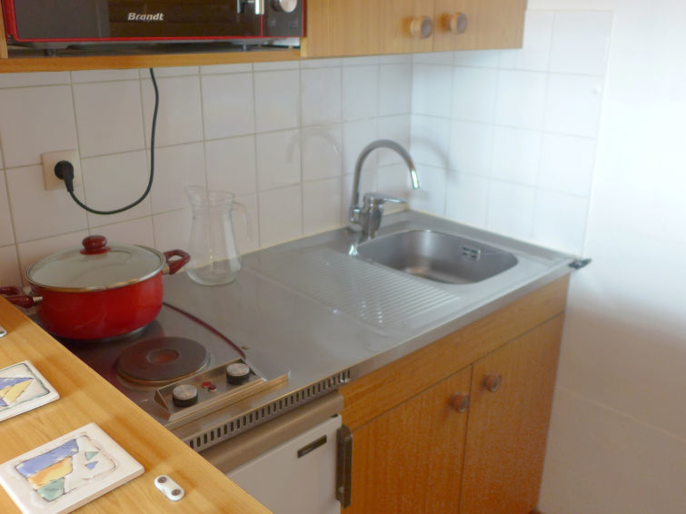 Appartement 1-kamer 20 m2 op de 2e verdieping. Woon-/eetkamer met 1 uitschuifbaar bed (2 pers. 2 x 80 cm), TV. Hal met 1 x 2 stapelbedden (80 cm). Kookhoek (2-pits kookplaat, magnetron). Bad/WC. Balkon, op het westen gelegen. Uitzicht op de bergen. Ter beschikking: Internet (Internet (WiFi), extra). Rookmelders.
