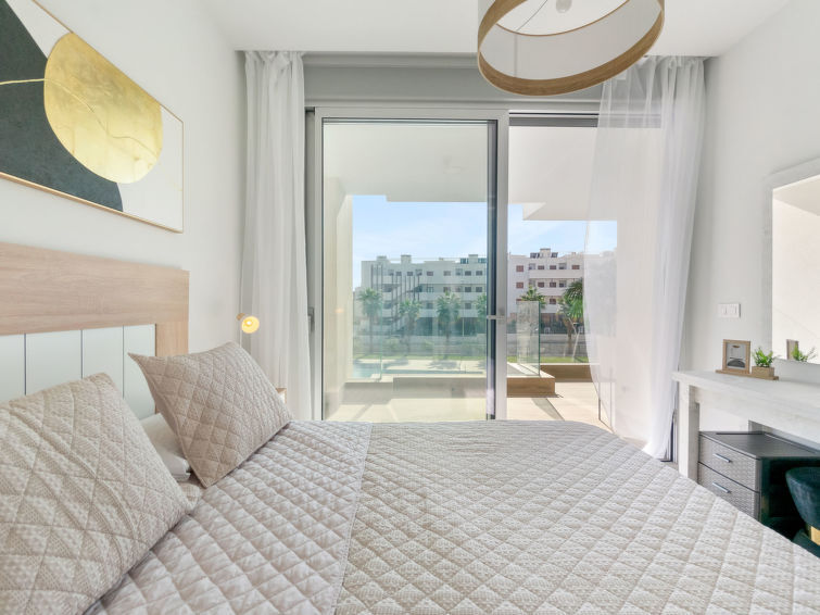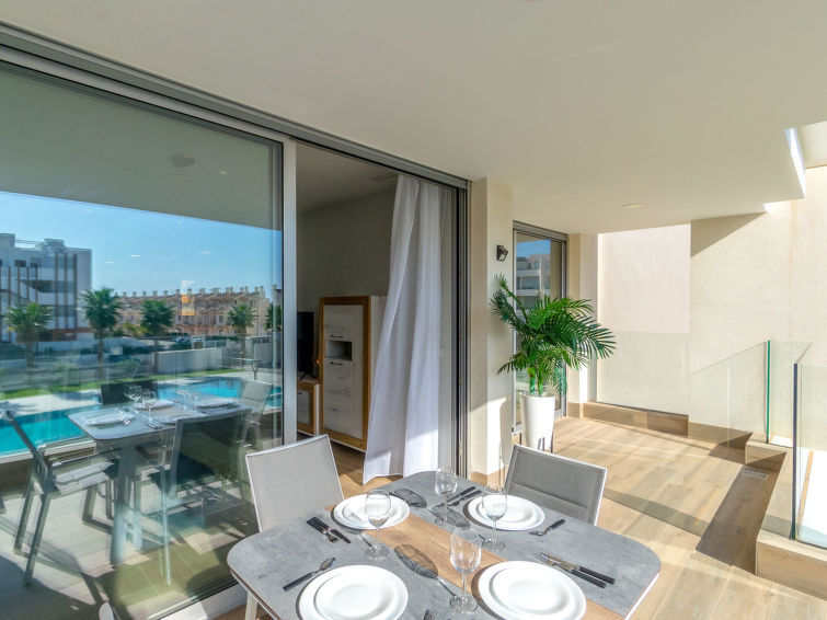 Moderne, mooi flatgebouw "Ema Residencial", van 4 verdiepingen, bouwjaar 2023. 3 km van het centrum van La Zenia, 4 km van het centrum van Punta Prima, 7 km van het centrum van Dehesa de Campoamor, gebied met weinig verkeer, 2.8 km van zee, 2.8 km van het strand. Voor medegebruik: terrein (omheind), openluchtzwembad (seizoensgebonden beschikbaarheid: 01.Jan. - 31.Dec.). Kinderzwembad, buitendouche, kinderspeelplaats. In het huis: lift. Levensmiddelenwinkel, supermarkt 950 m, restaurant 100 m, bushalte "Platja Flamenca – Mercadillo" 350 m, treinstation "Orihuela" 27 km, zandstrand "Playa la Zenia" 3 km. Golfterrein (18 holes) 1.9 km. De eigenaar accepteert geen groepen.